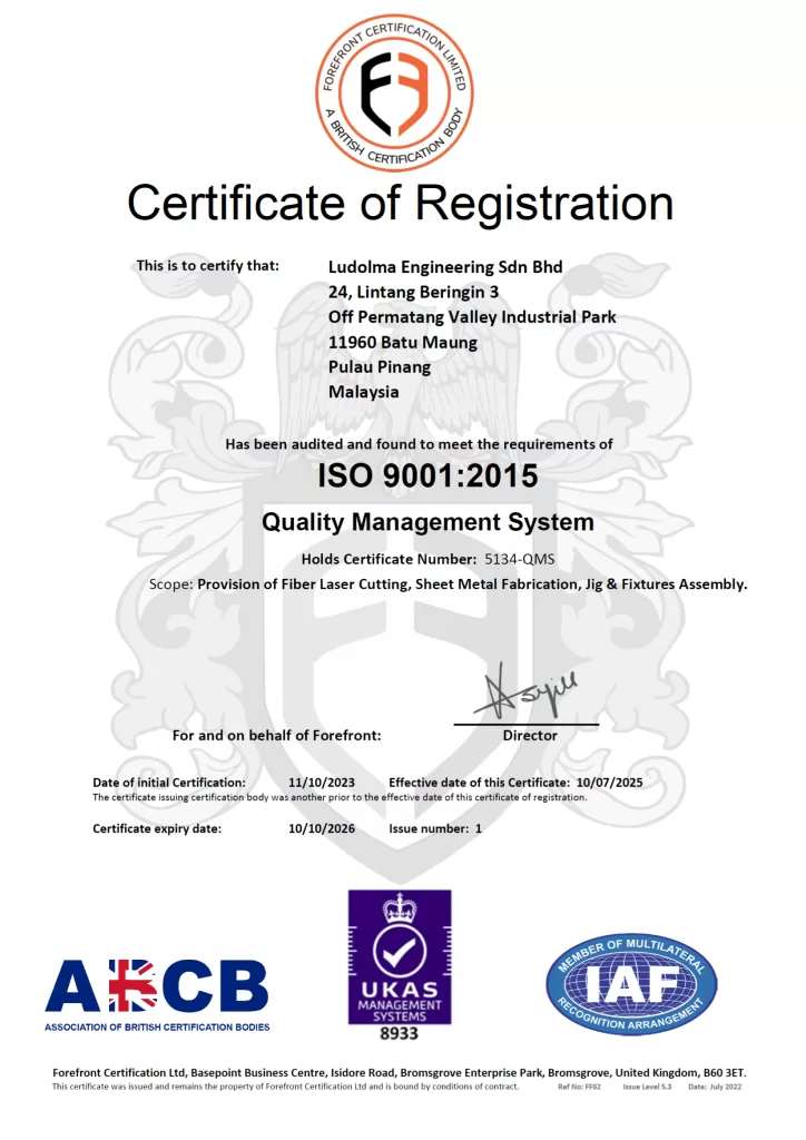 Ludolma Engineering is honored to hold ISO 9001:2015 certification, awarded by Forefront, which underscores our commitment to delivering the highest standards of quality and efficiency. This certification reflects our adherence to internationally recognized quality management principles and applies to our core services: fiber laser cutting, sheet metal fabrication, and jig & fixture assembly. It highlights our dedication to continuous improvement, customer satisfaction, and providing reliable, precision-engineered solutions for our clients across various industries.